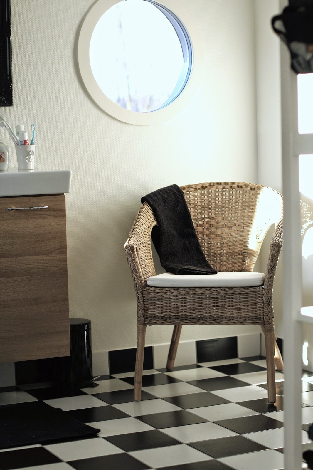 Bei mir im Sommerhaus auf Öland haben wir schwarzweisse Fliesen am Boden. Und obwohl ich zuerst ein bisschen skeptisch war, finde ich es heute toll. Nur die freistehende Badewanne fehlt mir noch. Aber was nicht ist kann ja mal werden!